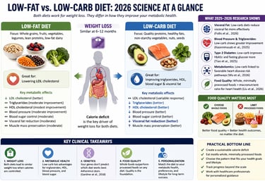 Both diets lead to similar weight loss over 6–12 months, but low-carb diets show better improvements in triglycerides, HDL, blood sugar, and visceral fat, while low-fat diets may reduce LDL cholesterol more effectively. The most important factor is diet quality and long-term adherence.