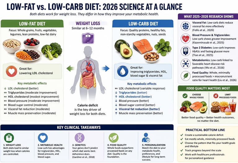 When findings from seven high-quality trials and meta-analyses are integrated, a consistent pattern emerges: weight loss is similar across low-fat and low-carbohydrate diets when calories are matched, but metabolic outcomes diverge in clinically meaningful ways.