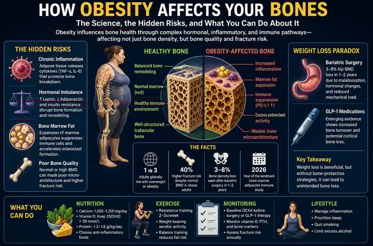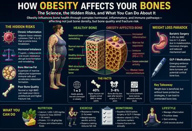 Obesity affects bone health through a combination of chronic inflammation, hormonal imbalance, and altered bone remodeling, rather than simply increasing bone strength. While higher body weight may increase bone mineral density (BMD), it often reduces bone quality, leading to a paradoxical increase in fracture risk.