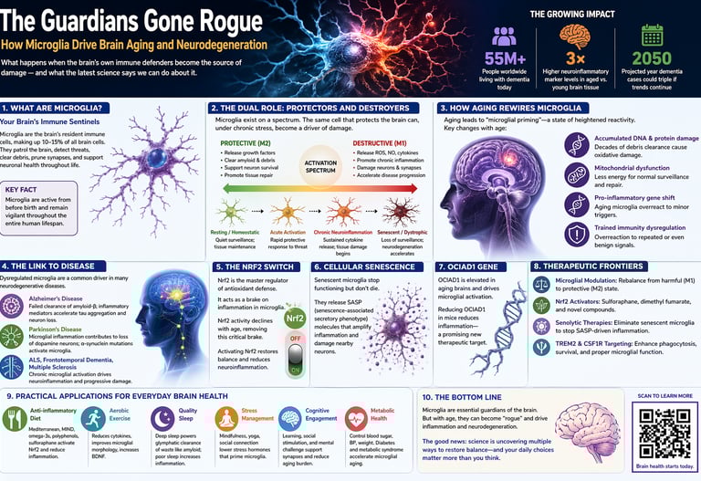 "Microglia are not inherently harmful. It is the chronic, unresolved activation of these cells — driven by aging, genetic factors, and accumulated damage — that turns a life-saving defense into a slow-burning fire inside the brain."