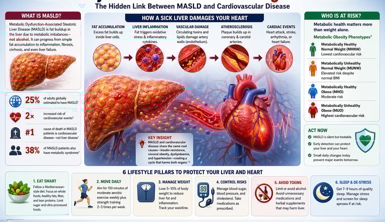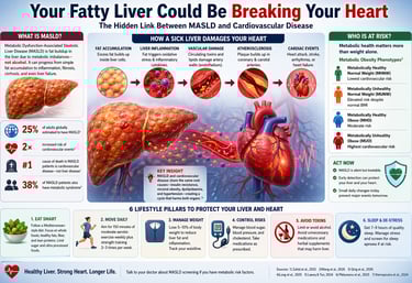 What makes MASLD particularly concerning, however, is not what it does to the liver alone — it's what it does to your heart. A growing body of research from 2024 to 2026 confirms that MASLD is not just a liver disease but a powerful driver of cardiovascular disease (CVD) — the world's leading cause of death. Understanding this connection could literally save your life.