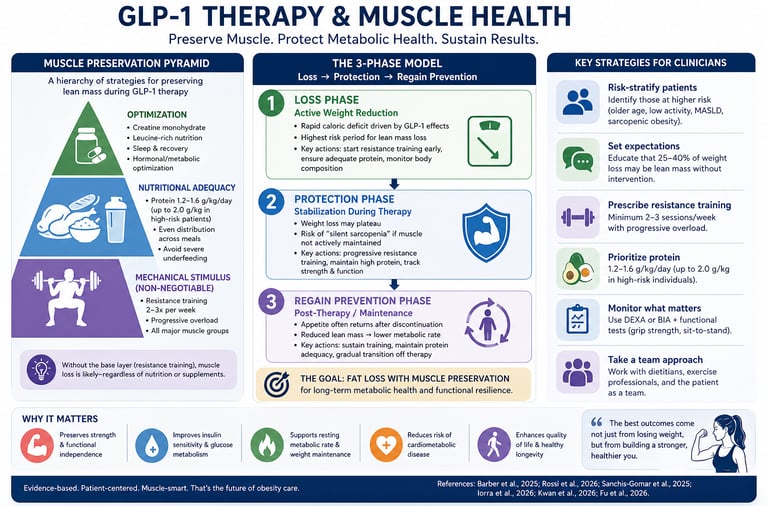 This evolving evidence shifts the clinical focus from simply achieving weight loss to optimizing body composition. The most effective approach combines pharmacotherapy with targeted strategies—particularly resistance training and adequate protein intake—to preserve muscle while reducing fat. Ultimately, the success of GLP-1 therapy should not be judged solely by kilograms lost, but by the extent to which it delivers durable metabolic health and functional resilience.