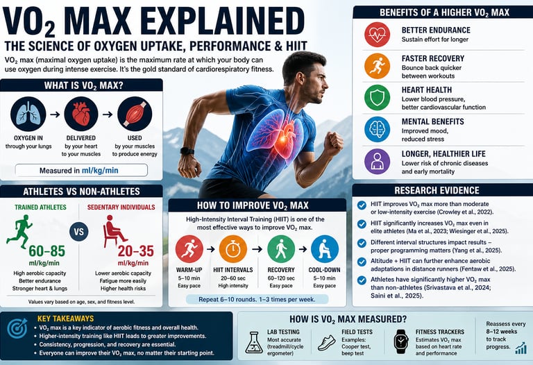 VO₂ max is a key indicator of aerobic fitness that reflects how efficiently the heart, lungs, and muscles use oxygen during exercise. Athletes have significantly higher VO₂ max than sedentary individuals due to long-term cardiovascular and muscular adaptations. Scientific evidence shows that high-intensity interval training (HIIT) is one of the most effective methods to improve VO₂ max, even in highly trained individuals. Consistent training, progressive overload, and recovery are essential for maximizing aerobic capacity and long-term health