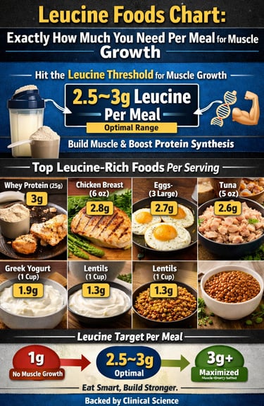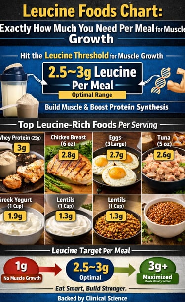 Discover the highest leucine-rich foods ranked by grams per serving. Learn how to hit the 2.5–3g leucine threshold per meal to maximize muscle growth, prevent sarcopenia, and optimize protein intake.