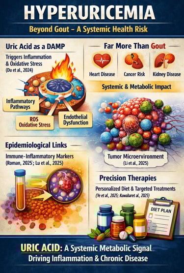 Hyperuricemia is no longer a biochemical footnote confined to gout clinics—it is emerging as a central player in systemic inflammation, metabolic dysfunction, and chronic disease risk. Traditionally defined as serum uric acid levels above 6.8 mg/dL, hyperuricemia was viewed primarily as a crystal deposition disorder. However, contemporary research reveals that soluble uric acid itself functions as a biologically active signaling molecule. Experimental and translational data show that uric acid acts as a danger-associated molecular pattern (DAMP), activating innate immune pathways, oxidative stress signaling, and endothelial dysfunction even in the absence of crystal formation (Du et al., 2024). Large-scale epidemiological analyses further demonstrate strong correlations between serum uric acid and systemic immune-inflammatory markers, reframing hyperuricemia as a driver—not merely a bystander—of chronic inflammation (Roman, 2025; Lu et al., 2025).
